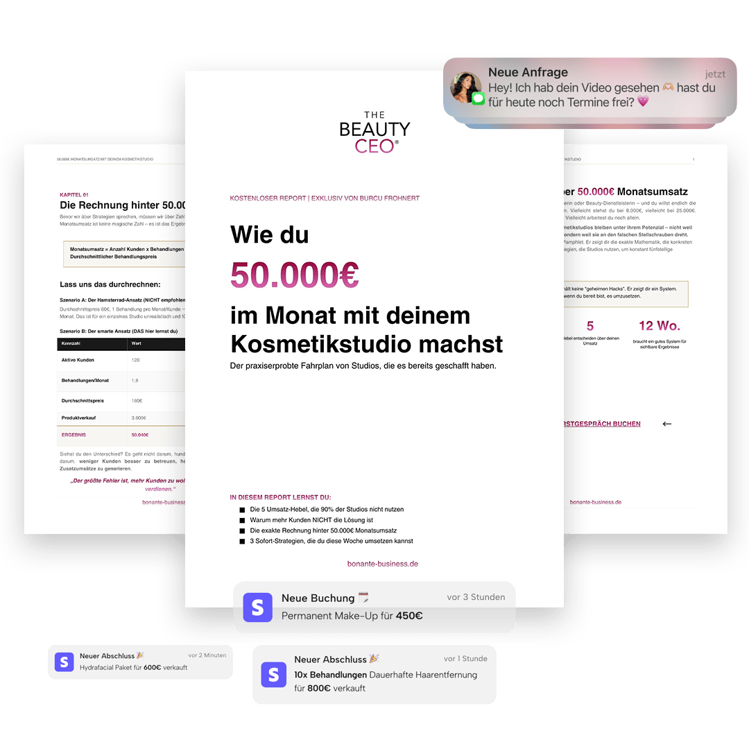 Dieser kostenlose 15-Seiten-Report zeigt dir das exakte System, mit dem Beauty-Studios in Deutschland, Österreich & Schweiz ihren Umsatz verdreifachen – Schritt für Schritt.